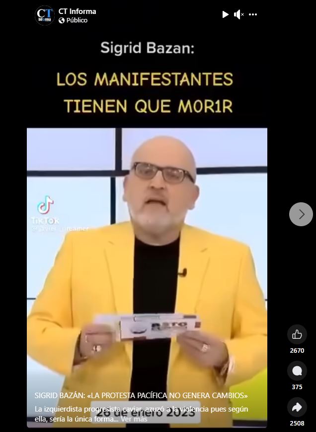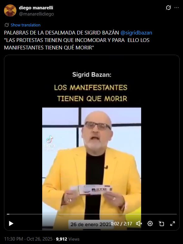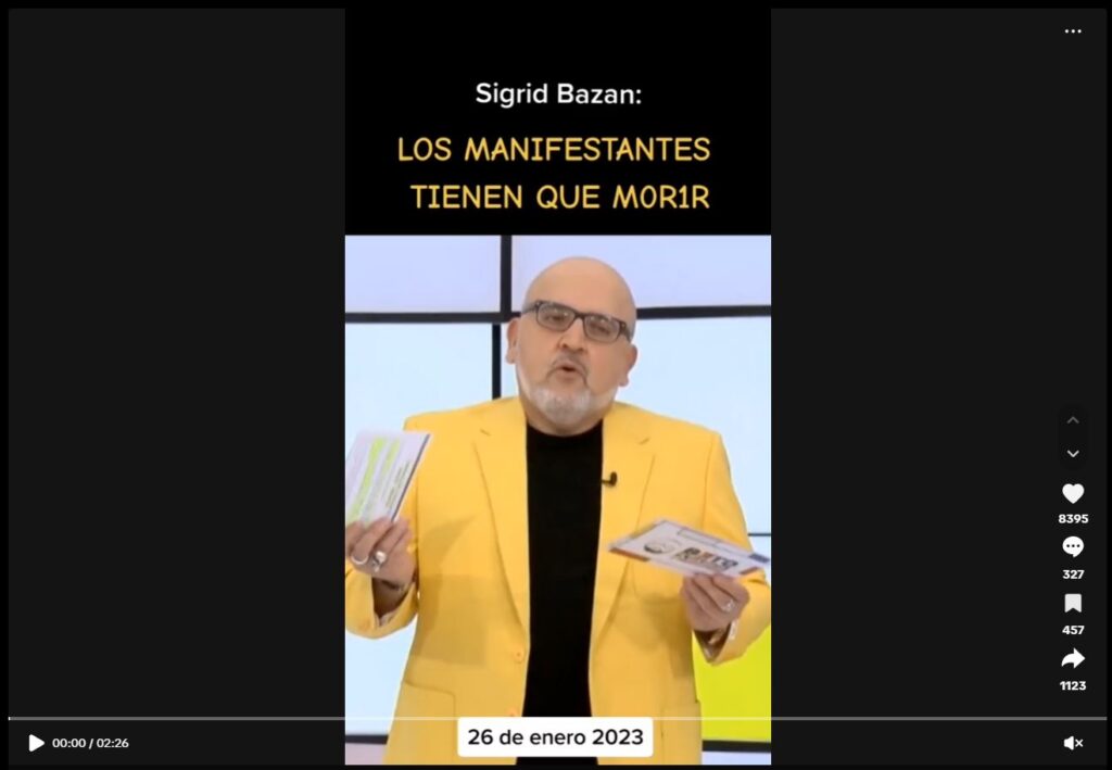 De acuerdo a la revisión efectuada por Al Margen, determinamos que es falso que Sigrid Bazán haya dicho que “los manifestantes tienen que morir” en el contexto atribuido.