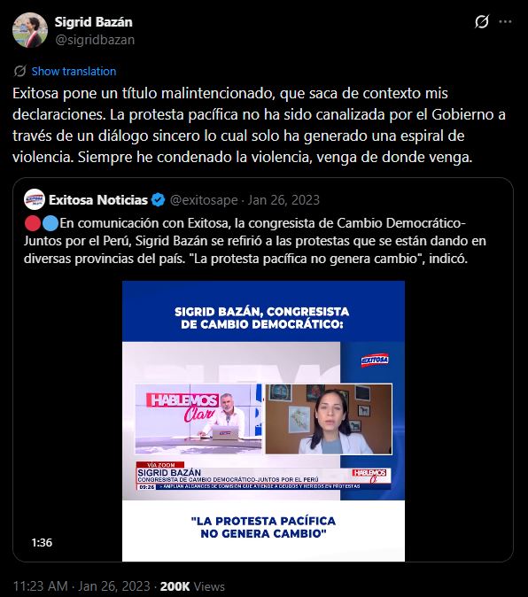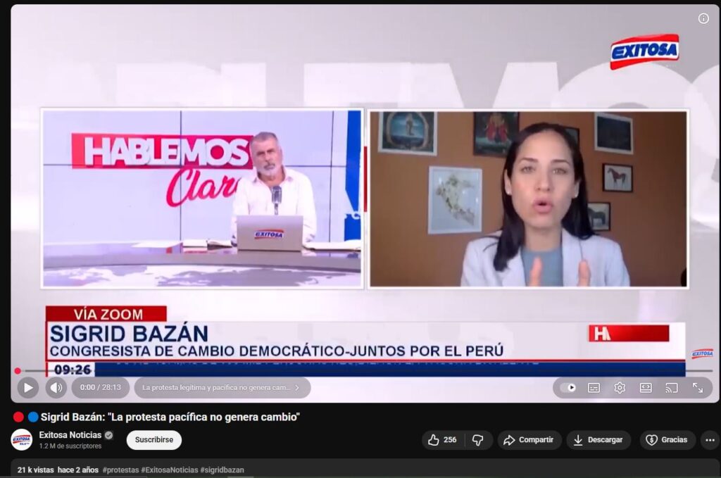 Durante las manifestaciones que ocurrieron en diversas regiones del país ante las extorsiones y la criminalidad, un extracto de las declaraciones de la congresista Sigrid Bazán durante una entrevista fue sacado de contexto y viralizado.
