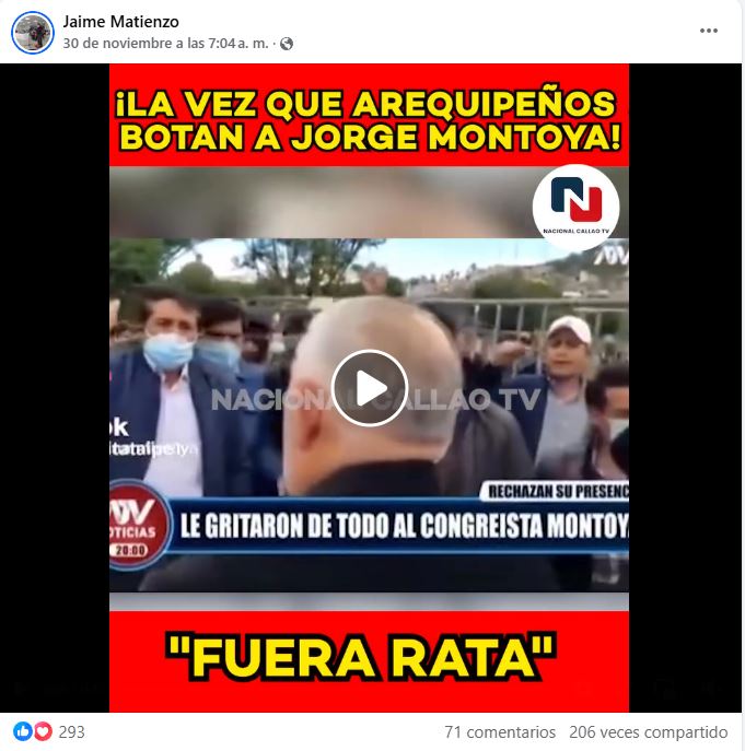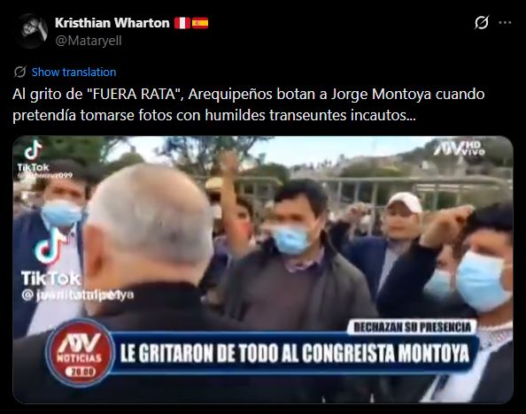 Así, el pasado 29 de noviembre empezó a circular un video en la red social X que muestra cómo al congresista Jorge Montoya, miembro del partido Honor y Democracia, supuestamente caminando entre gritos y abucheos en una presentación pública en Arequipa. De hecho, la publicación resalta el malestar de ciudadanos arequipeños ante la visita del parlamentario.